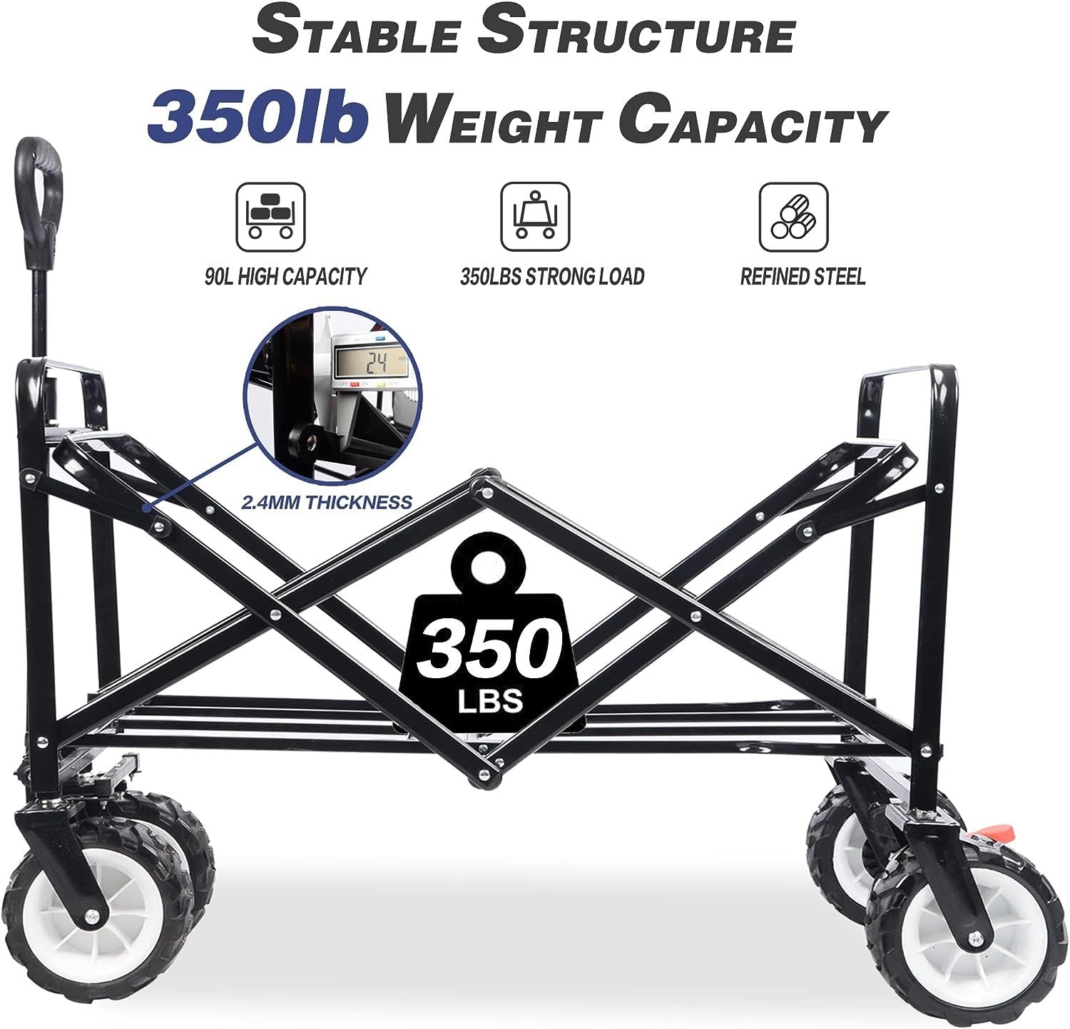 HIGH QUALITY- All terrain collapsible outdoor beach wagon beach cart uses sturdy steel frame and sturdy hardware, adopting full welding to make frame firmly reinforced. The collapsible outdoor wagon carts use double-layer oxford fabric and pearl wool, which is tightly stitched and it also has a high-quality PVC board. It has good touch, good quality and is not easy to wear and slip, easy to clean, more sturdy and has a long service life.