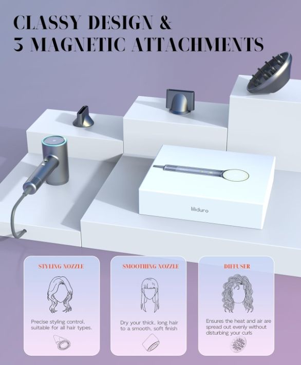 INTELLIGENT TEMPERATURE CONTROL - LILIDURO blow dryer temperature control chip with monitoring technology at a rate of 100 times per second, ensure stable and even airflow temperature that won't damage the hair; 3 heat settings + heat cycle setting, meet your various needs;