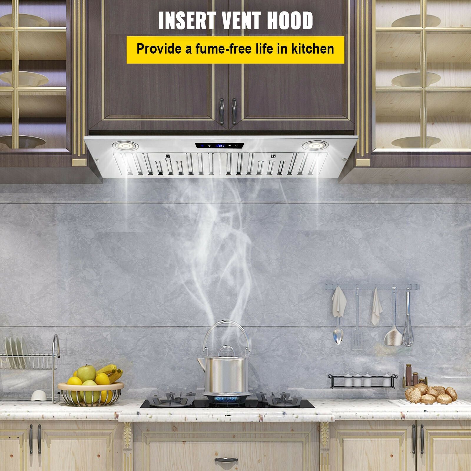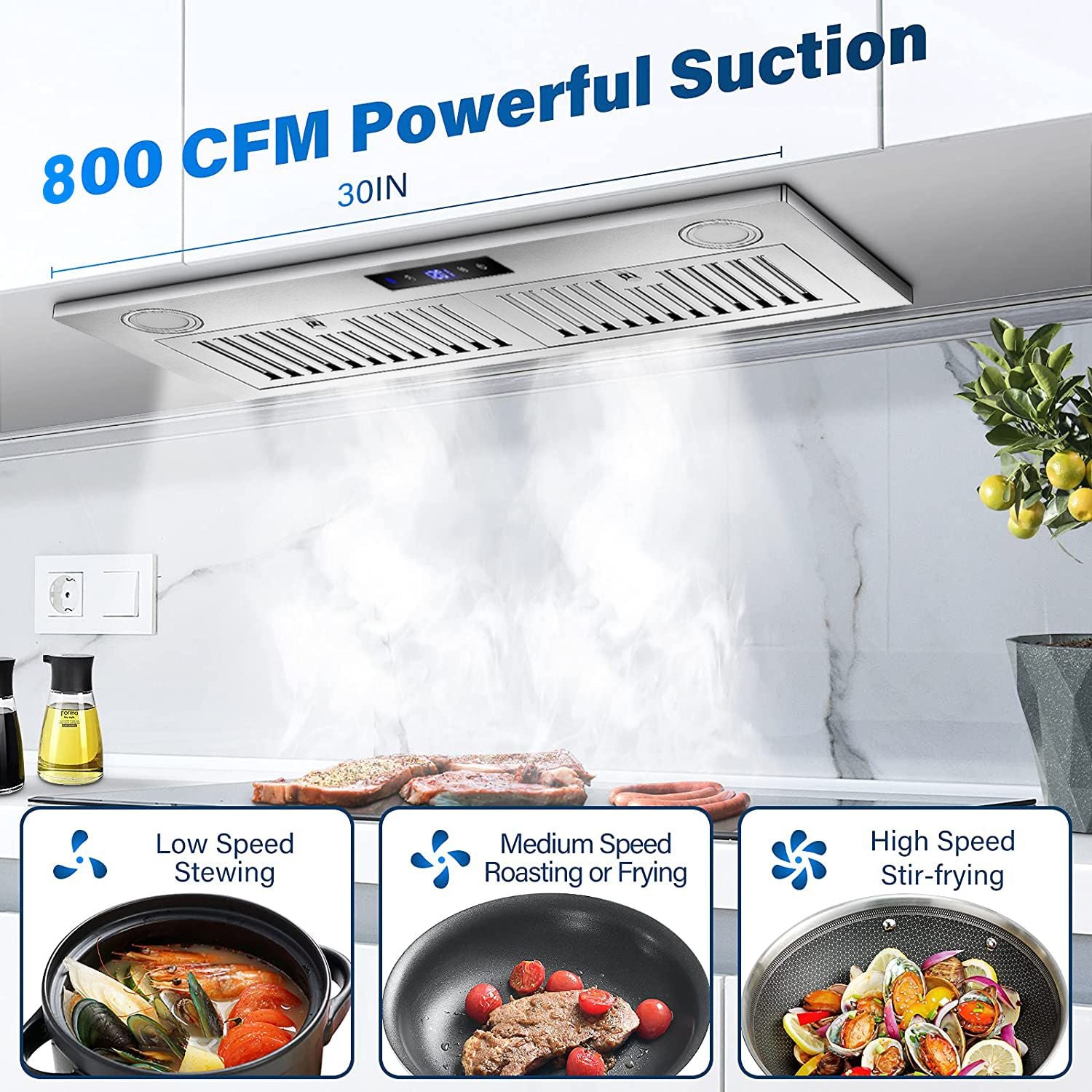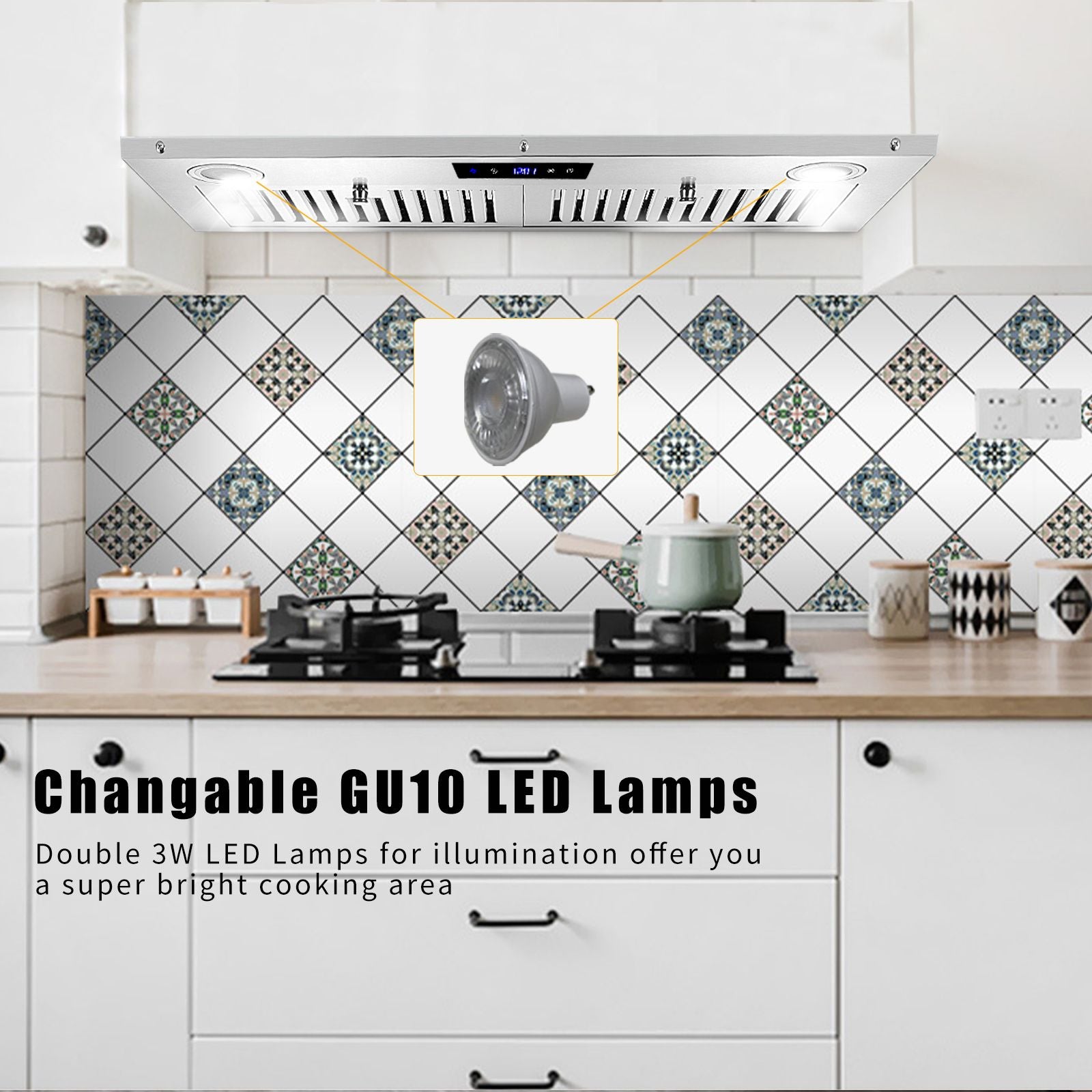 [Soft Touch Control Panel]Smart digital soft touch on vent hood board always do a good job no matter it is above hot temp stove or control by wet hands. You can trust it to work no matter what time to use it.