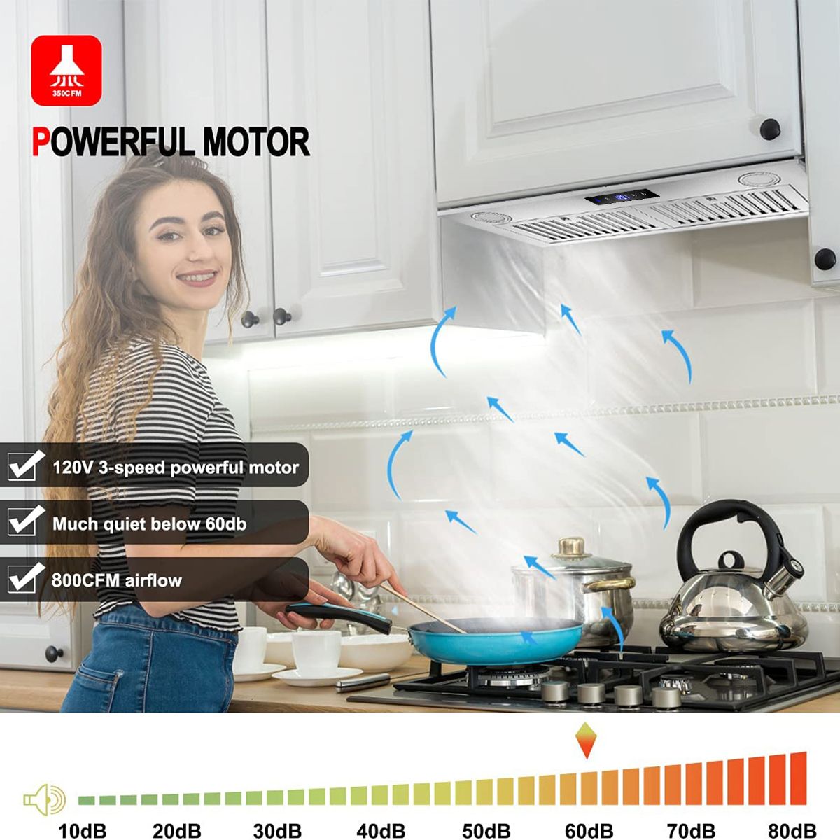 [600 CFM Powerful Suction But Quiet]Maximum 600 CFM great suction comes from powerful motor in range hood insert, able to work in good condition for several years. Maximum noise of this insert stove vent is only 65dB, just like walking in park.