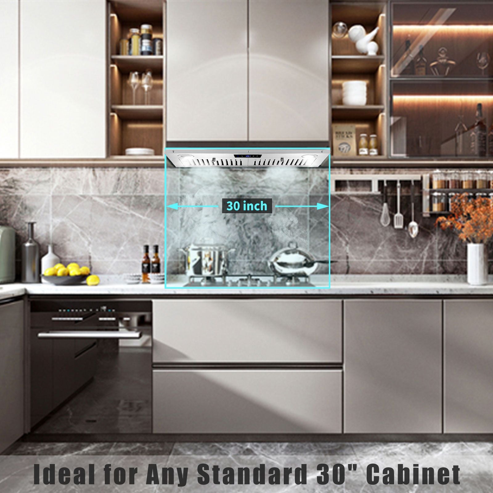 [Dishwasher Safe Stainless Steel Filters]Both baffle filters of insert range hood 30 inch were made from #430 stainless steel, with good corrosion resistance. Due to its good corrosion resistance, baffle filters can be auto-cleaned by dishwasher safely.