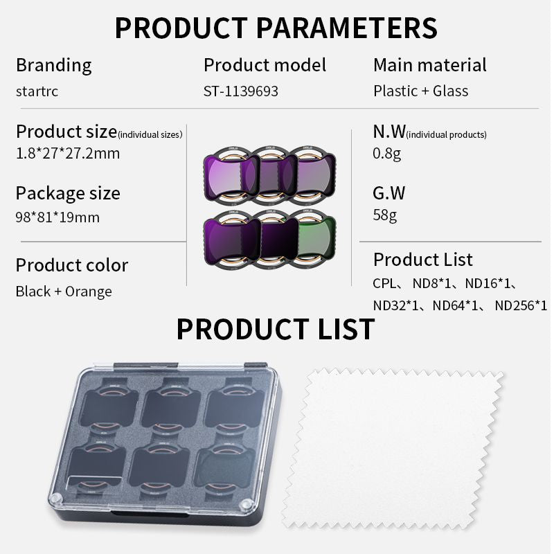 Lightweight Ultra Slim Frame: Precision engineered through CNC machining, these filters feature an ultra-slim aluminum frame, weighing merely 0.03oz/1.3g each. Their sleek design ensures a seamless fit onto the drone lens, guaranteeing no compromise on flight stability or performance.
