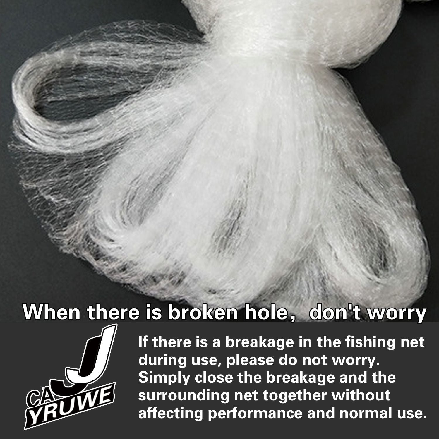 The fishing net is very thin, so please do not pull too hard. fine lines is to fish better, thick lines cannot catch fish, so I will explain it to you here.If there is a breakage in the fishing net during use, please don't worry. Simply close the breakage and the surrounding net together without affecting performance, and it can be used normally.